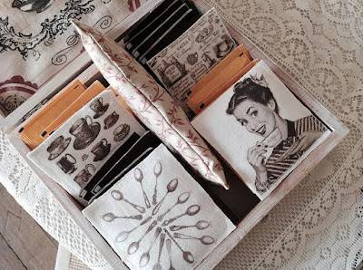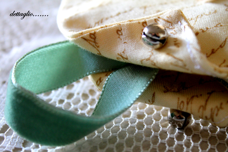 Le immagini stampate su lino e tratte da web sono state tutte valorizzate con ricami perline e nastri con charms delicati che impreziosiscono tutto