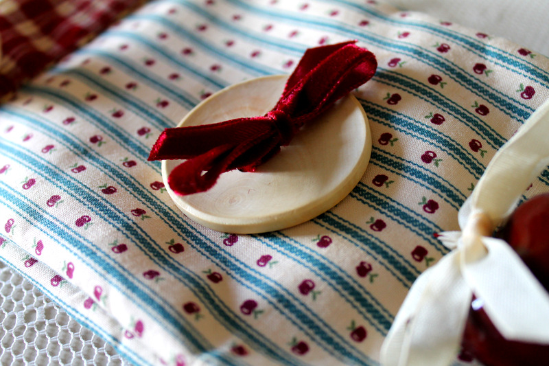 Una tinozza piena di mele e dei grandi bottoni in legno fermati da due nastri in velluto insieme ad un grande cuore di ferro laccato decorano il lato opposto